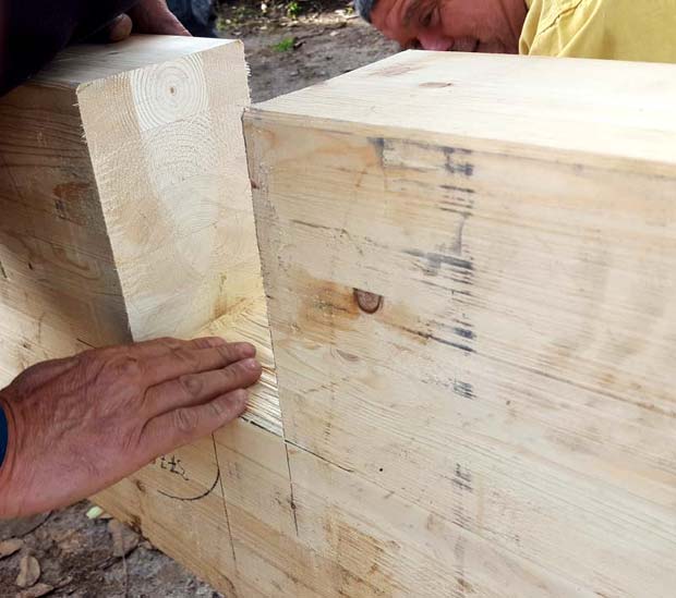 2. Les deux poutres perpendiculaires de 7,60 m sont placées debout et taillées avant d’être basculées en place.