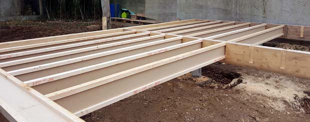 La dalle est constituée de poutres en lamellé-collé d’une taille assez conséquente (140 de largeur x 400 mm de hauteur) dans laquelle sont encastrées des poutres I (300 mm de hauteur). Les entraxes des poutres I se calculent comme pour des solives ou en se reportant à la documentation technique fournie par le fabricant.