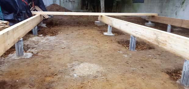 Dans le cadre de l’auto-construction de la petite maison bois-paille nous avons réalisé une dalle bois sur des plots en béton armé.