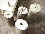Scier deux morceaux de bois brut en deux rectangles de la même dimension, 19 x 24 cm. Les poncer pour obtenir un bois sans aspérités. Débiter, en s’aidant d’une boite à onglet et d’une scie à dos, des branches d’environ 3 cm de diamètre en tronçons de 6 cm et de 24 cm. Utiliser une seule branche pour tous les étages d’un même montant. Ne pas hésiter à jouer sur la morphologie irrégulière des branches