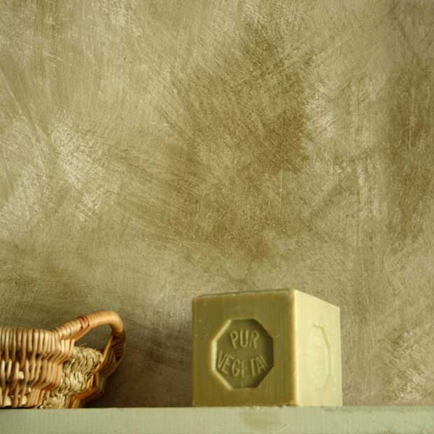 Cette recette est à base de pigment (ici Terre d’Ombre) et de vernis transparent Dammar. Elle teinte et protège durablement la surface sur laquelle elle est appliquée. Son temps de séchage est très court. Le glacis a été posé à la brosse large sur les murs d’une salle de bains.