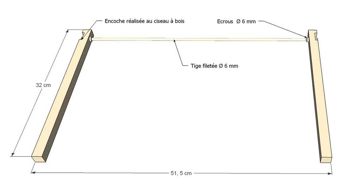 5.Scier les deux chutes conservées de l’étape 1 à 32 cm. Réaliser des encoches avec un ciseau à bois ou une mèche à bois avec une tête plate (voir étape 1). Pré-percer des trous avec la mèche à bois de Ø 6 mm pour pouvoir glisser la tige filetée de Ø 6 mm. Placer des écrous des deux côtés pour obtenir une largeur de 51,5 cm. Scier la tige filetée avec une scie à métaux.